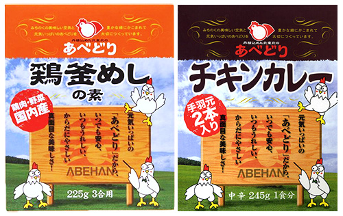 みちのくの大自然の中、きれいな水、餌にこだわり大切に育てられている『あべどり』を使った食品加工を行う『あべはんグループ』より、やわらかめな肉質のあべどり手羽元2本がゴロっと入った『チキンカレー』と、炊飯器で簡単に調理ができる『鶏釜めしの素』をセットで。